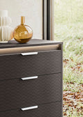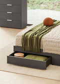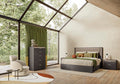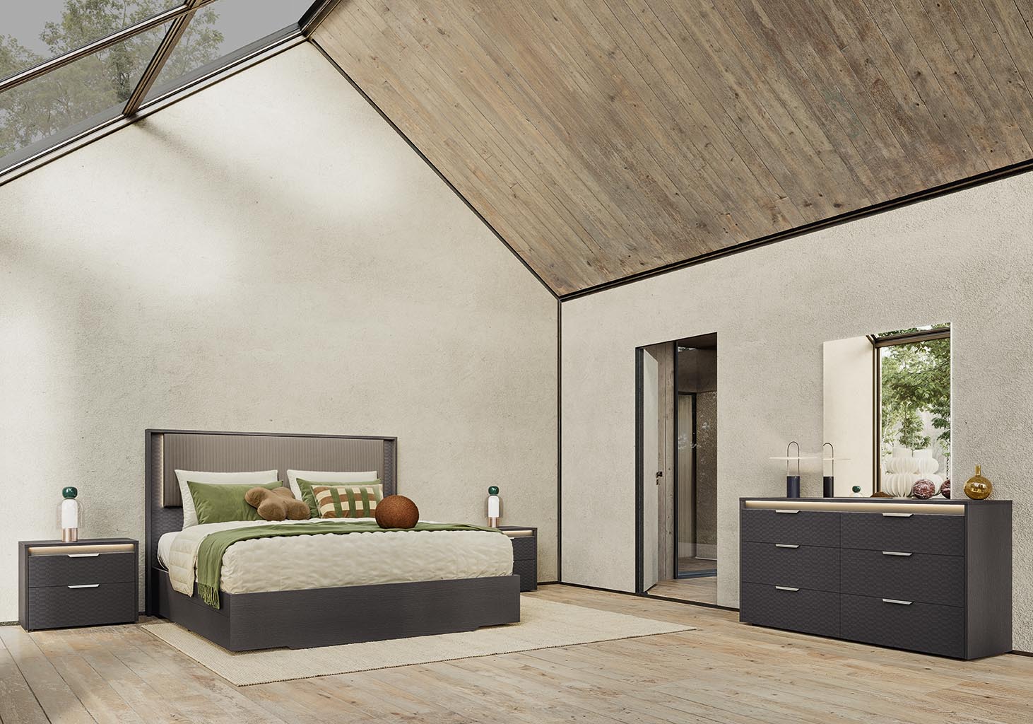 The Amy bed features an eco-leather headboard with integrated lighting and two storage drawers in the platform, offering style and practicality. The nightstands, with Tetris-textured drawer fronts and top-edge lighting, complete the look, adding modern elegance to any bedroom.