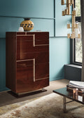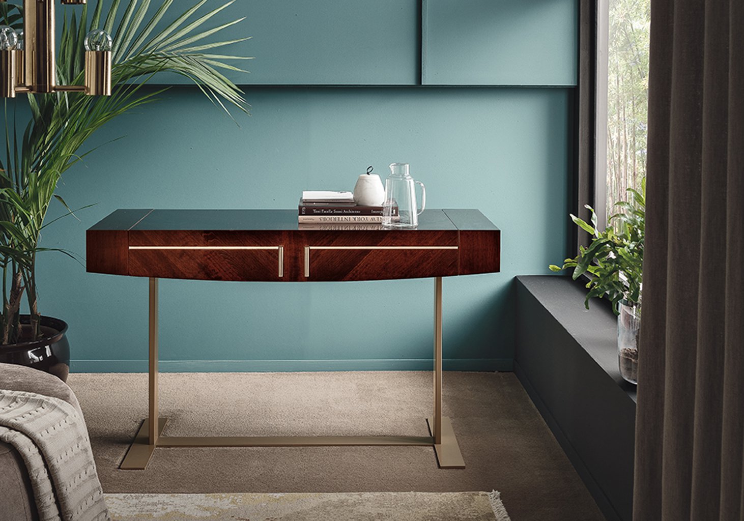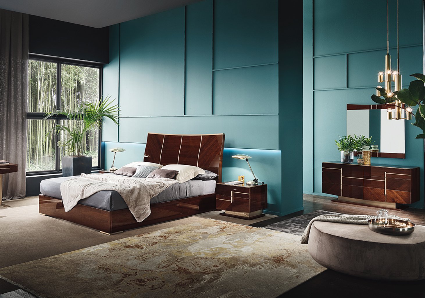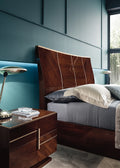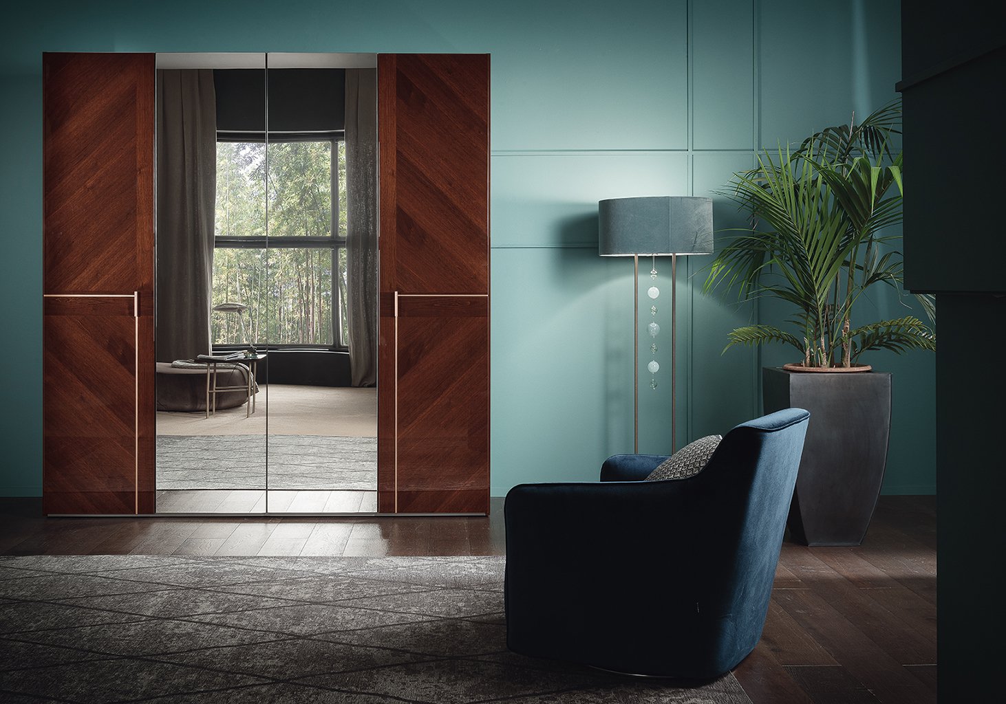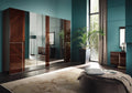 Bellagio Coffee-tinted walnut meets metal in a rose gold finish in this collection made up of bed, dresser, bedside tables, drawer unit, mirror, vanity unit and wardrobes.