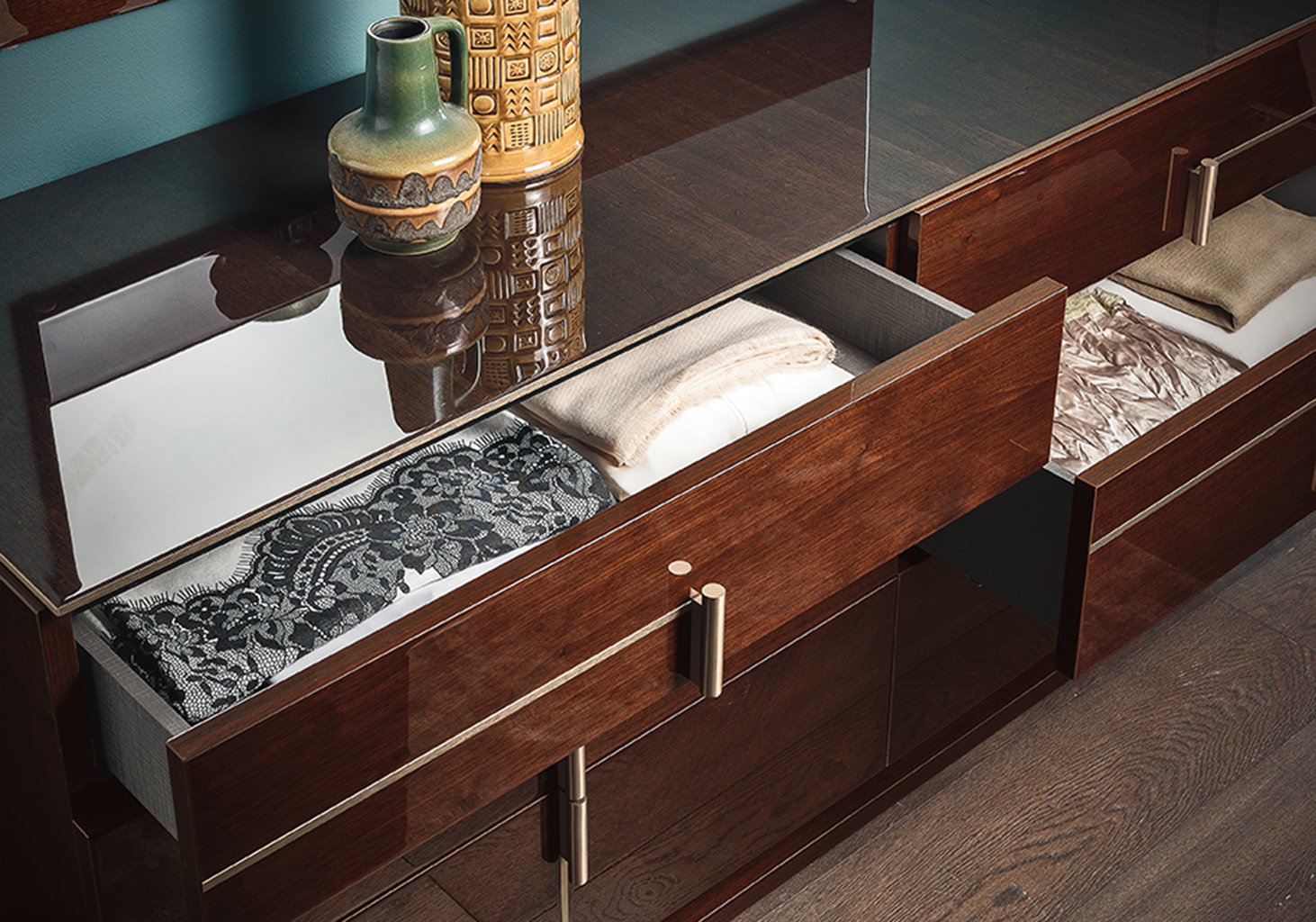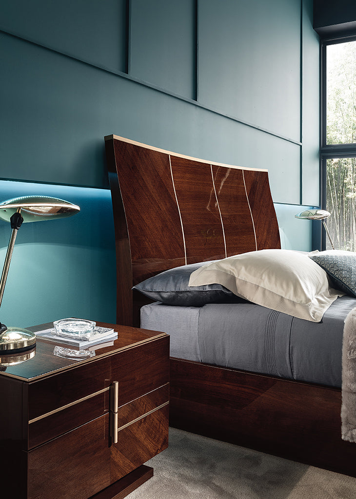 In addition to the bed in different sizes, the Bellagio collection includes a dresser, bedside tables, tall chest of drawers, mirror, vanity unit and wardrobes. All complements can be ordered separately or as a composition, to furnish your whole bedroom.