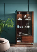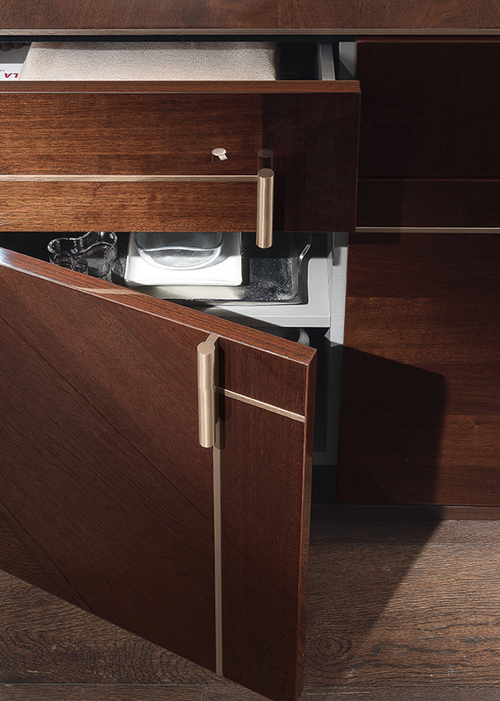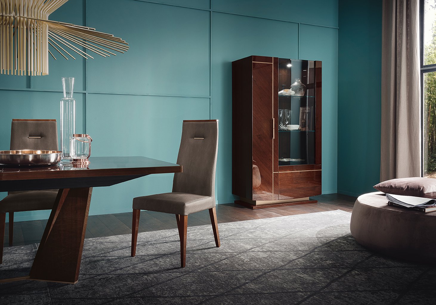 Coffee-tinted walnut meets metal in a rose gold finish in the Bellagio collection for the dining room, made up of various tables, chairs, bookcases, sideboards, display cabinet and mirror.