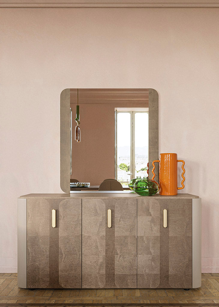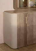 For the Hebe Collection, we combined two distinct materials and aesthetics. We began with earthy brown wood featuring a Matte Saddle Birch Inlay, which showcases elegant inlays on the front panels and tabletops.