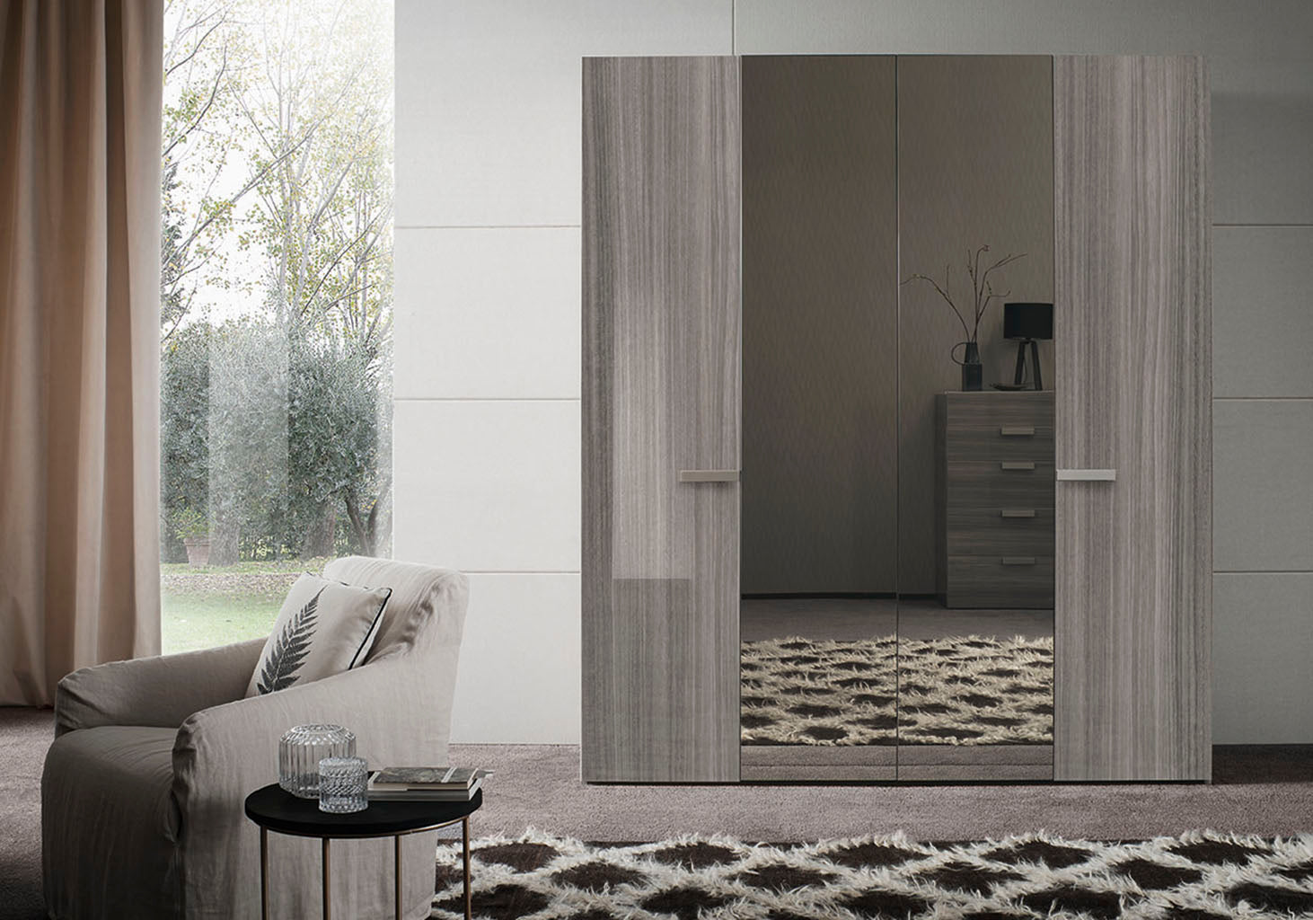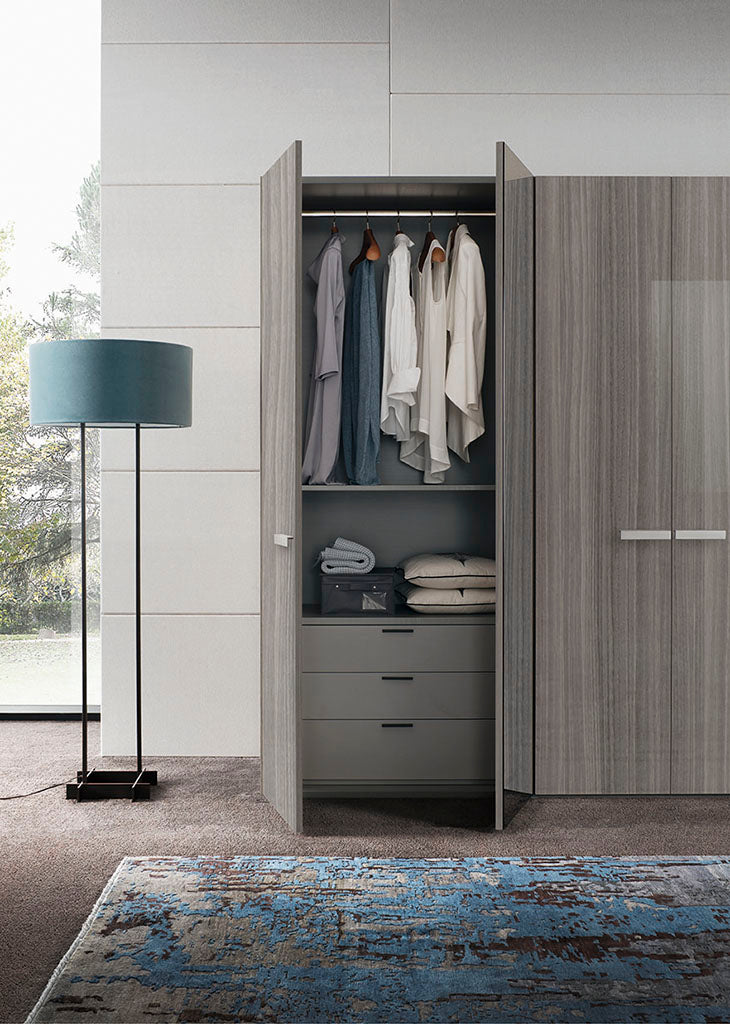 The wardrobe with swing doors, also in a mirrored version, is spacious and fitted with shelves and handy poles for hanging clothes up.