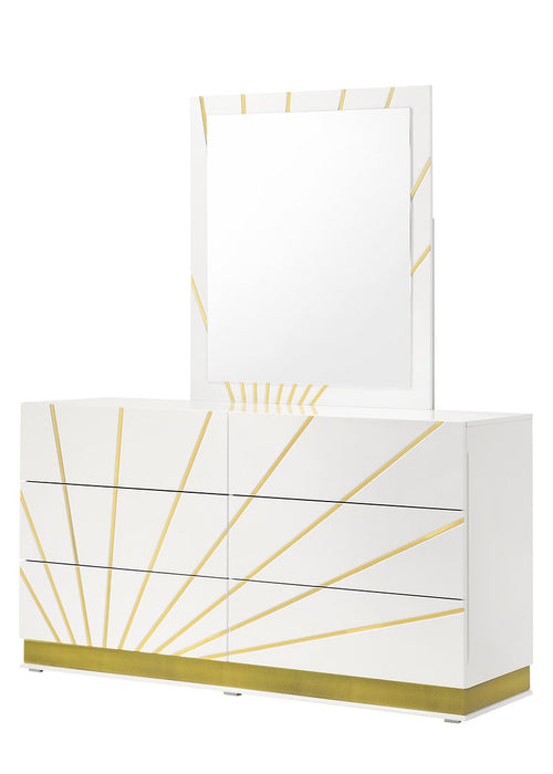 B59 Safa Bedroom Set is a contemporary masterpiece that effortlessly combines sleek sophistication with modern trendiness. Its high-gloss white and gold finish exudes elegance, while the LED lighting on the headboard and under the bed adds a touch of luxury, creating a genuinely showstopping look for any bedroom. This modern bedroom set epitomizes refinement with its clean white finish and minimalist design. Complete with a chic bed frame, practical nightstands, and a spacious dresser, this set strikes the perfect balance between style and functionality. Meticulously crafted with premium materials, the Safa Bedroom Set promises enduring elegance, transforming your space into a serene retreat where contemporary design meets unparalleled comfort.