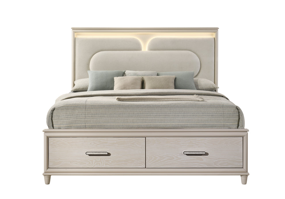 Features: Headboard & Mirror with LED, Wooden bun-feet, Storage Bed, No Boxspring needed, Nightstand w/USB & Type C, Ball bearing glides, Grain embossed panel at drawer front only and Upholstered soft fabric headboard.
