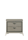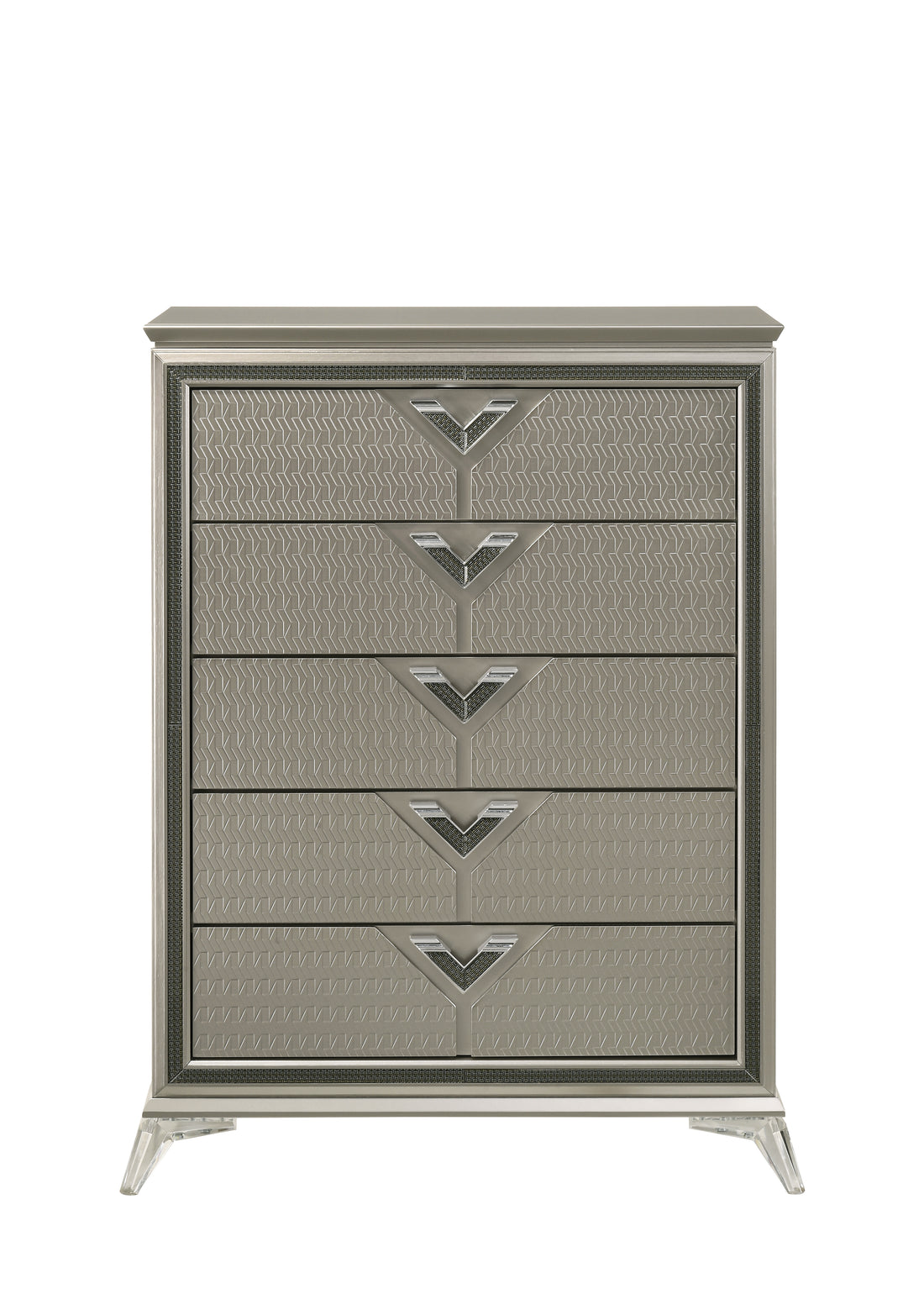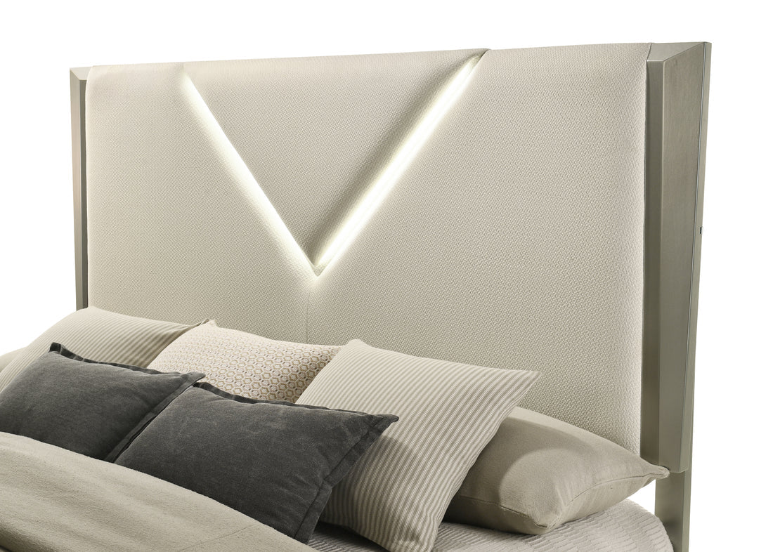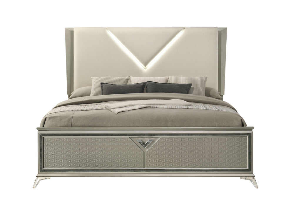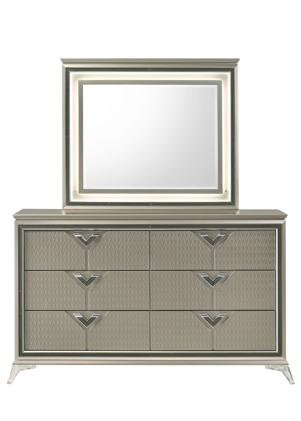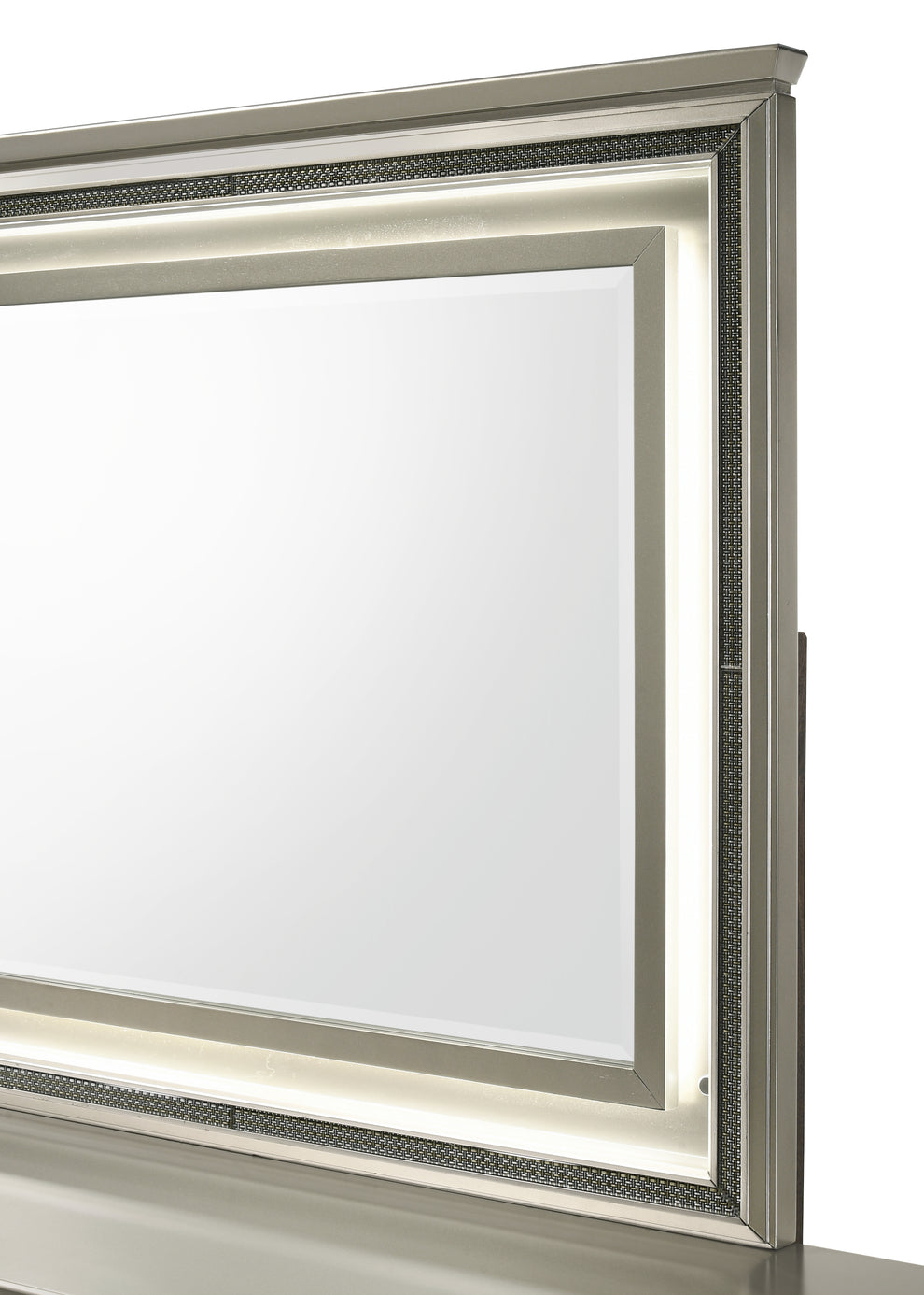 The B6850 Larana bedroom set in Olive Silver brings contemporary elegance to your space with thoughtfully designed details. Features include a striking zig-align grain embossed panel on the drawer front, a headboard and mirror enhanced with LED lighting, and acrylic bun feet paired with metal legs for sophisticated support. The upholstered grey soft fabric headboard adds comfort and style, while decorative black-silver fiberglass accents on the front frame create visual interest. Practical touches include a nightstand with USB and Type C charging ports, smooth ball bearing glides for effortless drawer operation, and an integrated jewelry box for organized storage. This set combines form and function for a bedroom that's both beautiful and livable.