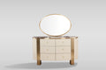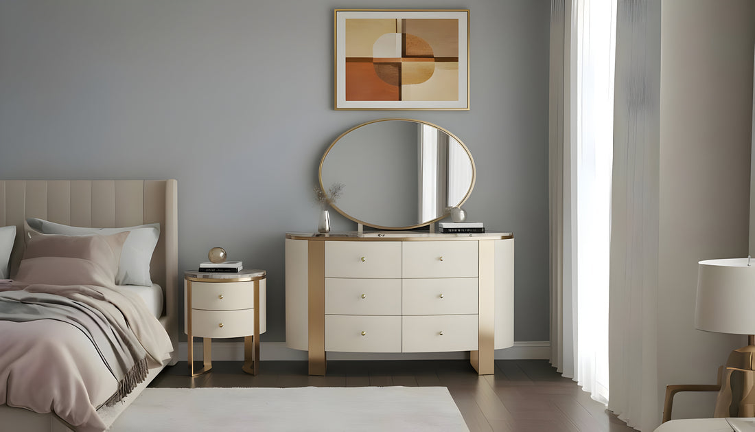 Transform your bedroom into a sophisticated sanctuary with the Corvina collection. This elegant three-piece set features a spacious dresser with six drawers, a matching nightstand with two drawers, and a brushed stainless steel mirror. Crafted with premium artificial stone tops, cream white cabinetry, and brushed gold accents, each piece combines timeless style with modern functionality. Self-closing drawer slides ensure smooth, quiet operation, while the coordinated design creates a cohesive, luxurious aesthetic. Perfect for those seeking refined elegance and practical storage solutions that elevate any bedroom décor.