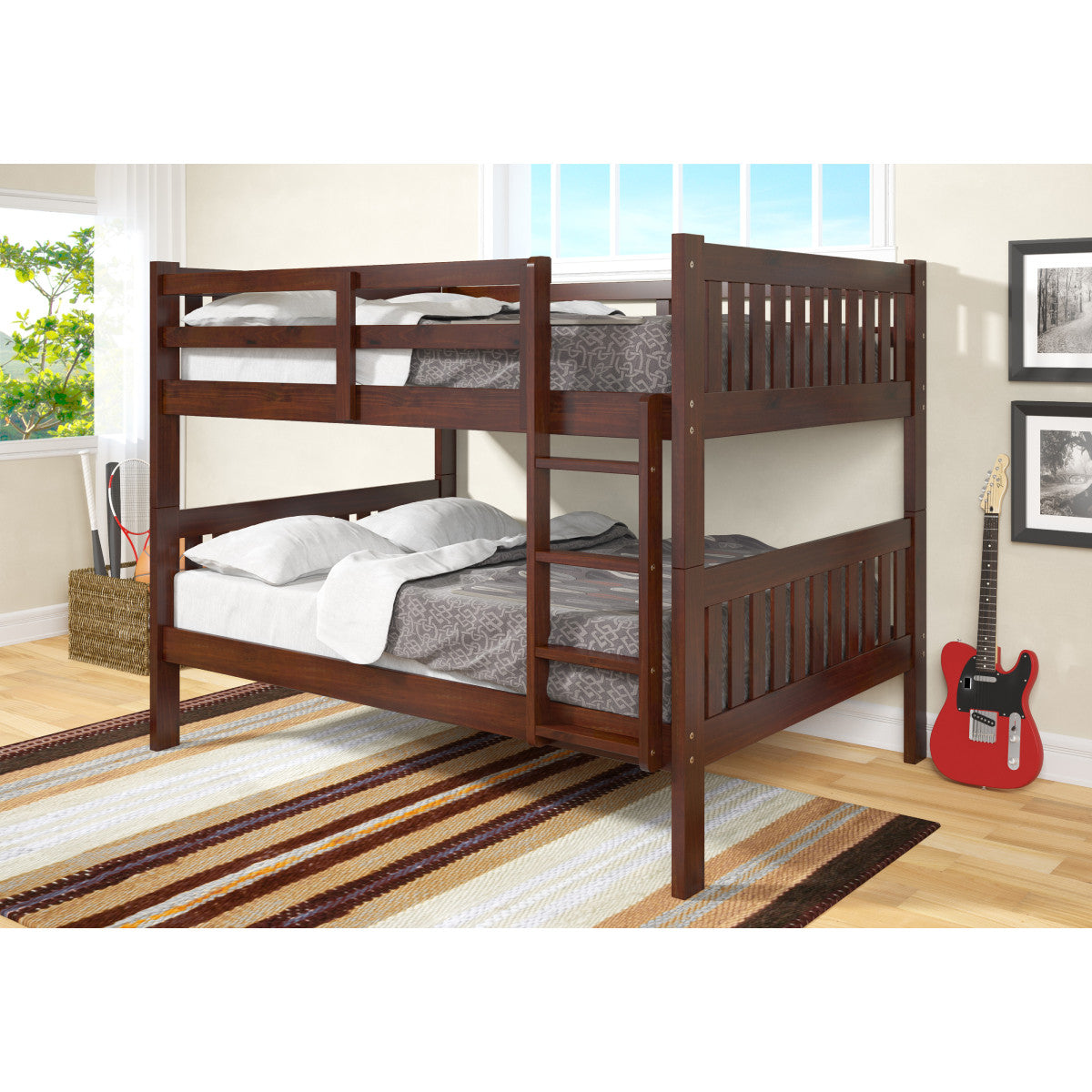 Description: This solid pine bunkbed is sure to be the center of childhood memories. The dark cappuccino color pairs well with any décor. The classic mission style looks great in any room.