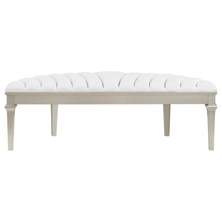 | • Double arch head and footboards feature lush ivory fabric upholstery with foam padding • Silver oak finish with glimmering accent panels is elegant and modern, delivering a glam finishing touch • Framed beveled mirror creates an instant dressing vanity setup • Hexagonal shaped hardware with pearl-like center accents offers a modern flair • Soft grey felt lining on the top dresser drawers offer space for delicates |