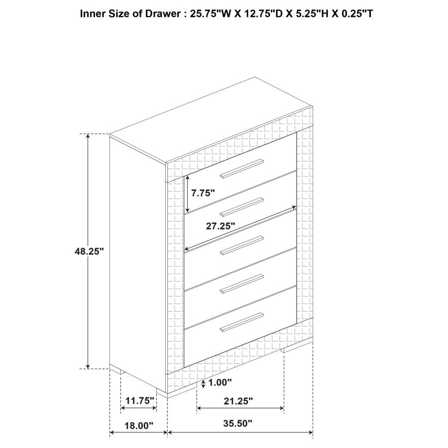 | Upgrade your bedroom with this luxurious five-piece set, featuring a bed, nightstand, dresser, mirror, and chest. The set showcases a high gloss finish and 3-dimensional diamond tile emboss, offering a contemporary Italian aesthetic. Each piece is designed for both style and practicality, with ample storage options and thoughtful details like felt-lined top drawers. The bed includes a touch LED light in the headboard, enhancing the ambiance of your space. This set is ideal for those who desire a sophisticated and cohesive bedroom design. | |