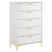 * Finish: White * Upholstery: White leatherette * Metal finish: Gold * Foundation required * Slats: 4 * Drawers: Kenlin metal drawer glides * Distance from floor to top of slat: 7" * Drawer structure: English dovetails front and back * Number of drawers: Nightstand - 2, Dresser - 6, Chest - 5 * Hardware type: Pull handle |