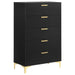 Complete your primary suite with this modern glam bedroom set, designed with a foam padded bed upholstered in soft, black velvet for extra comfort. A smooth, black finish covers the surface of each drawer, creating a chic, bold look. Gold finished hardware including bracket style legs, drawer pulls, and bar shaped buttons along the diamond tufted headboard offer a warm, metallic glimmer and interest. The two-drawer nightstand, six-drawer dresser, and five-drawer chest offer all the garment storage you need. Mount the black framed mirror on the dresser to make the most of the space and create a vanity setup.