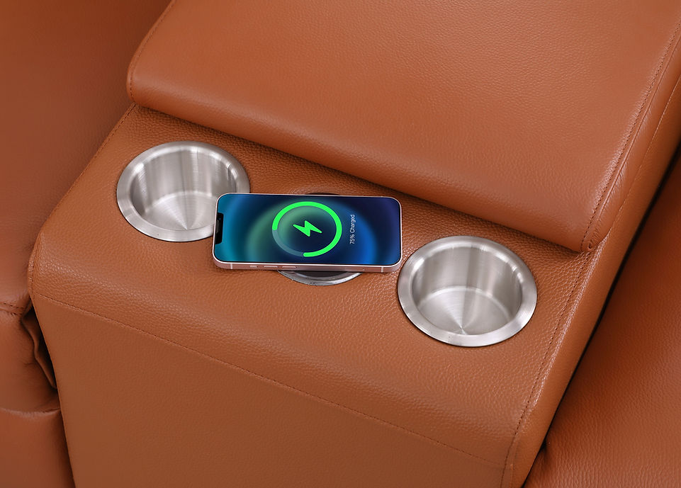 Introducing the exquisite Picasso Sectional in a refreshing Carmel hue, a testament to modern Contemporary Style. Crafted with meticulous attention to detail, this sectional features a harmonious blend of luxury and functionality. The Leather Match upholstery offers a perfect balance between opulence and practicality. Equipped with three Power Recliners and two Power Headrests, this sectional ensures personalized comfort at your fingertips. The thoughtfully designed Console comes with convenient Cupholders, allowing you to relish your favorite beverages while lounging. To keep you connected, a built-in Wireless Charger ensures your devices stay powered without interruption. Elevate your living space with the Picasso Sectional, where sophistication and innovation converge seamlessly.