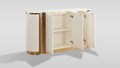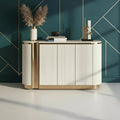 The Valente Sideboard brings sophisticated elegance to any dining space with its striking design and practical functionality. Featuring a luxurious artificial stone top paired with gleaming gold stainless steel accents, this cream-colored piece makes an instant style statement. Three spacious doors with convenient push-to-open technology eliminate the need for handles, creating a seamless, modern aesthetic. Adjustable shelves inside adapt to your storage needs, whether you're displaying fine china or organizing everyday essentials. A versatile addition that combines contemporary design with timeless appeal.